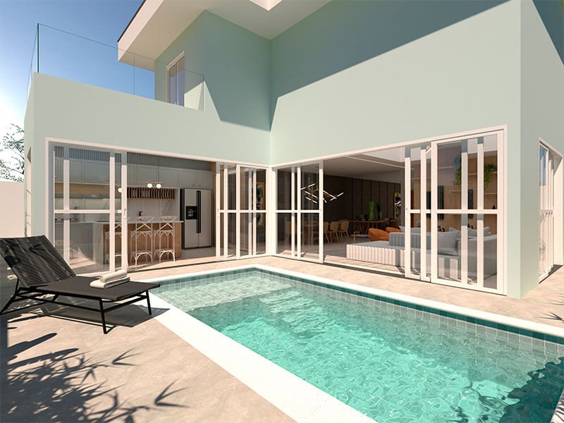 A área social desta casa acontece de forma fluída entre o mobiliário, permitindo ampla integração entre os ambientes.