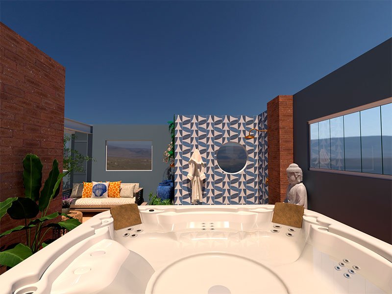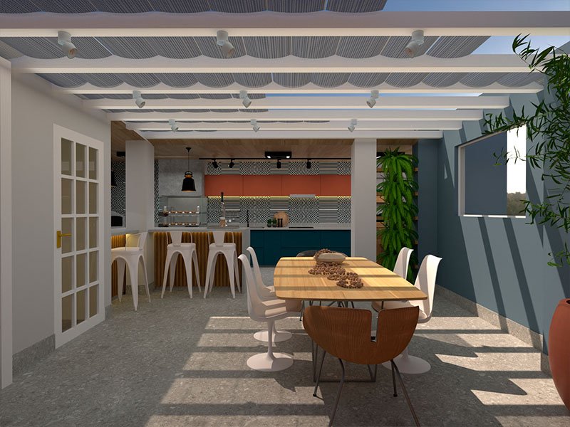 Cobertura R&D . A área gourmet é integrada sob um pergolado metálico, com persianas tela solar para garantir o conforto térmico na hora das refeições.