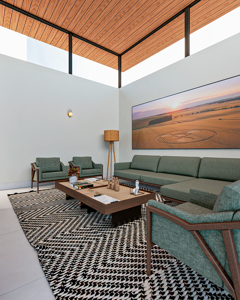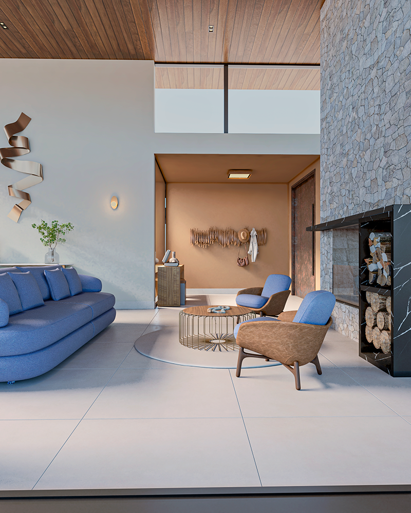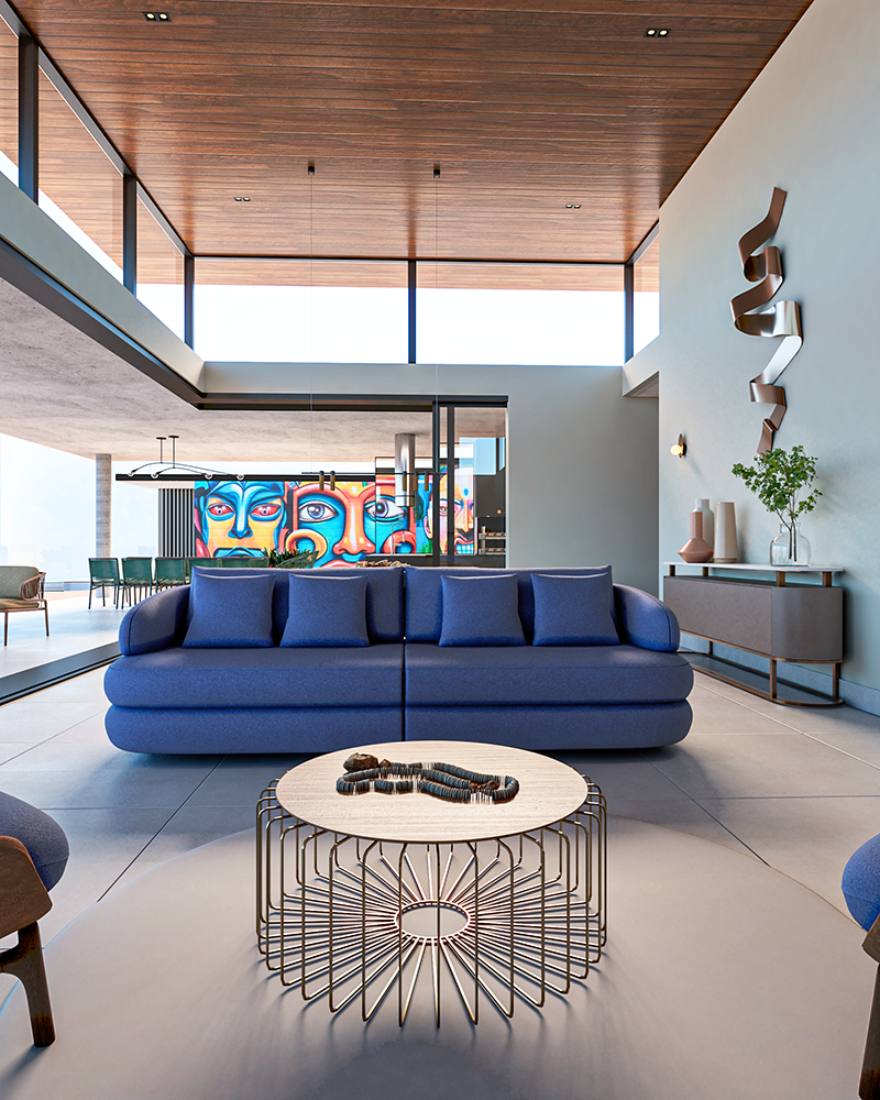 A área social desta casa acontece de forma fluída entre o mobiliário, permitindo ampla integração entre os ambientes. O pé direito duplo da sala, promove leveza e luz natural em abundância.