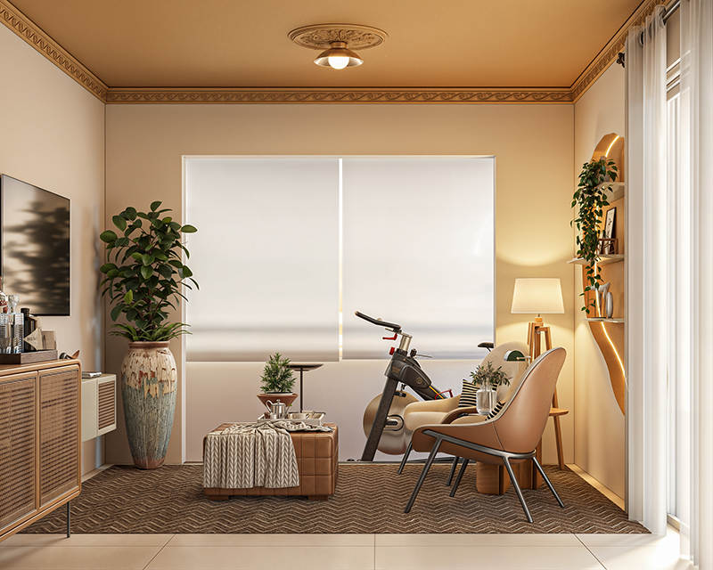 Nesse projeto, também criamos um espaço fitness integrado à área social, sem comprometer o visual da sala.