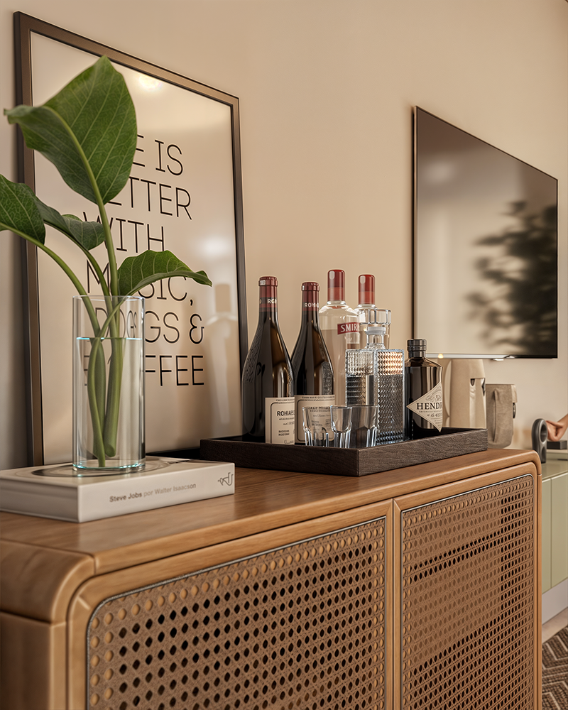 E nesse projeto, cada detalhe foi pensado para gerar afeto e funcionalidade, como esse cantinho do bar, que une o charme da palhinha natural com o calor da madeira. A combinação perfeita para receber bem ou simplesmente aproveitar um fim de tarde com estilo.